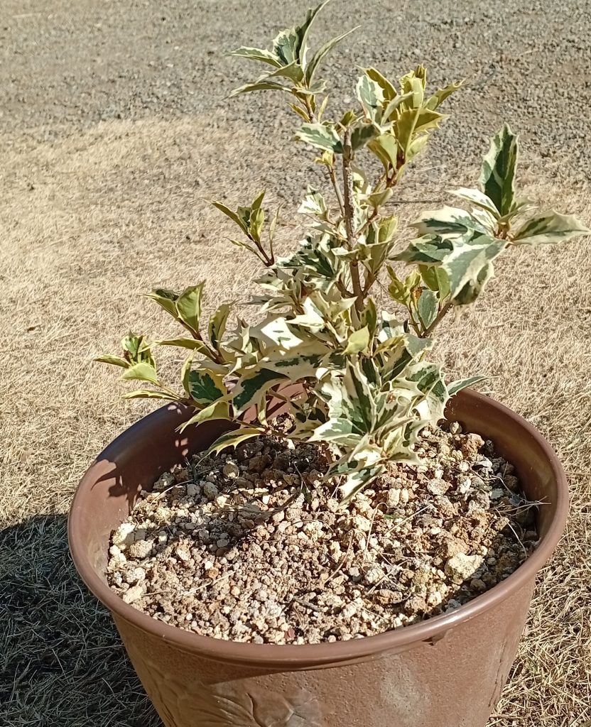 ヒイラギの鉢を玄関に置きました。(I placed a pot of holly at the entrance to the house.)